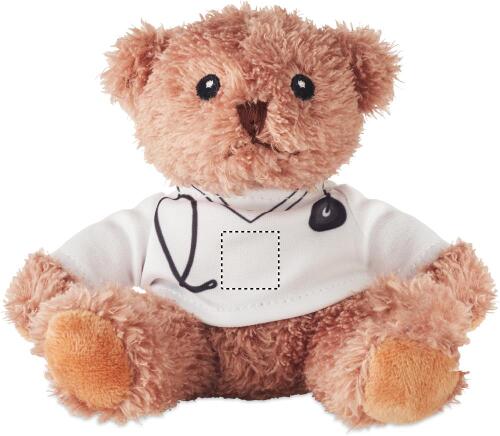 Orsacchiotto di peluche in poliestere vestito da dottore con maglietta bianca stampata. Occhi, naso e bocca ricamati.