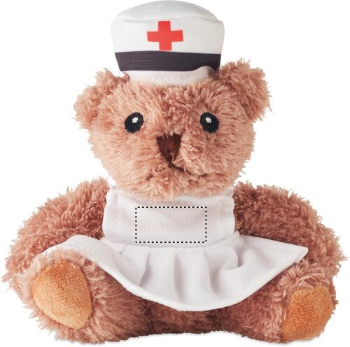 Orsetto di peluche in poliestere vestito da infermiera con maglietta bianca stampata. Occhi, naso e bocca ricamati.