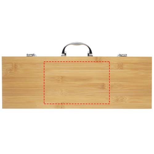Set da barbecue in bambù composto da 5 pezzi: spatola (40 x 9,5 cm), pinza (34,5 x 6 cm), forchettone (38,5 x 3 cm), coltello (38,5 x 3 cm) e spazzola (38 x 4,3 cm). Il set viene consegnato in una confezione regalo in bambù (46 x 16,2 x 7,4 cm). I manici e la confezione regalo sono realizzati in bambù ottenuto e prodotto in base a standard ecosostenibili.