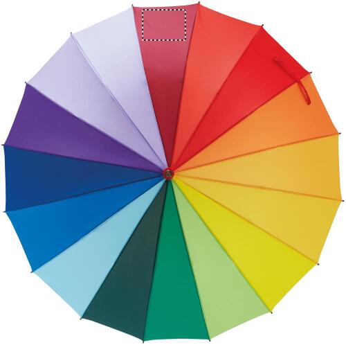 Ombrello arcbaleno da 27 pollici con apertura automatica in 190T Pongee con asta in legno, stecche in fibra di vetro, punte e parte superiore in metallo placcato nero. 16 pannelli.