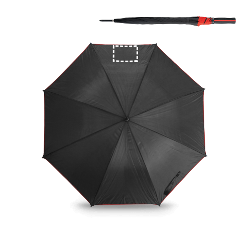 Ombrello in poliestere 190T con struttura in EVA e meccanismo automatico di apertura. Dettaglio con striscia colorata sull'ombrello e sul manico