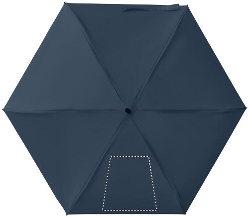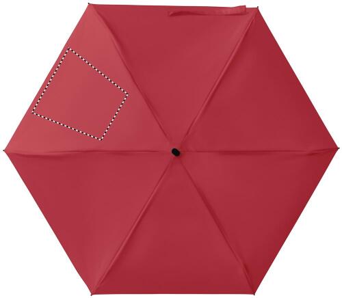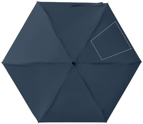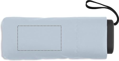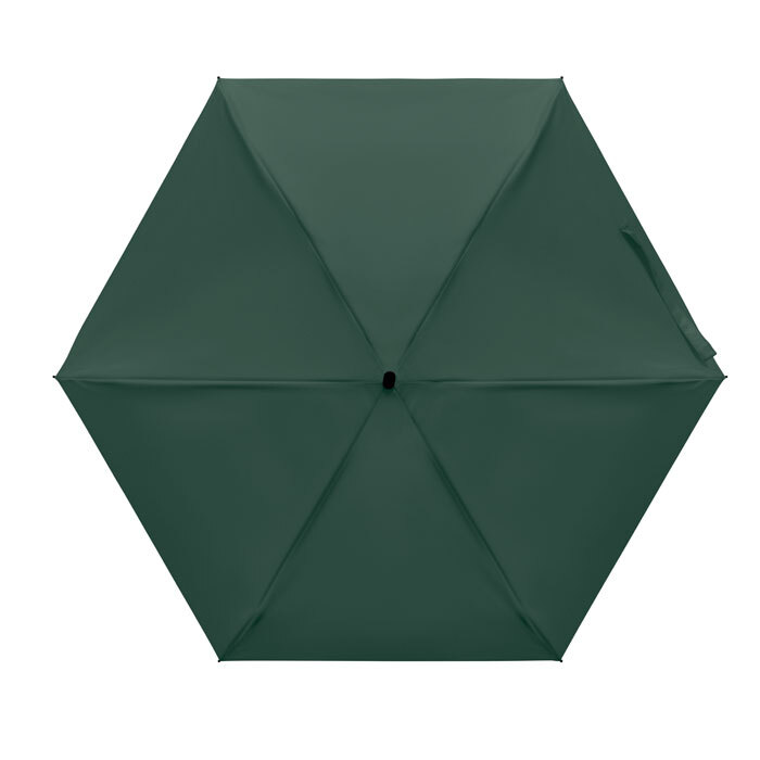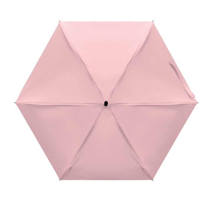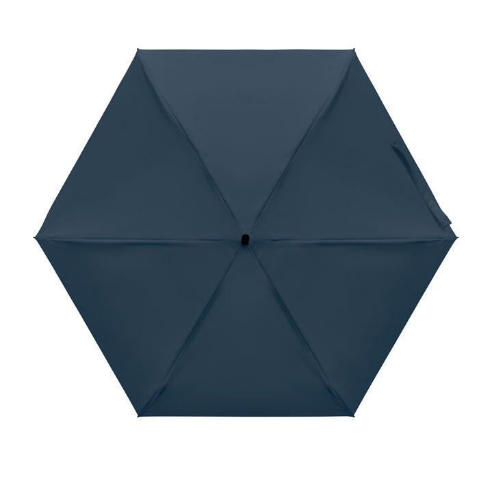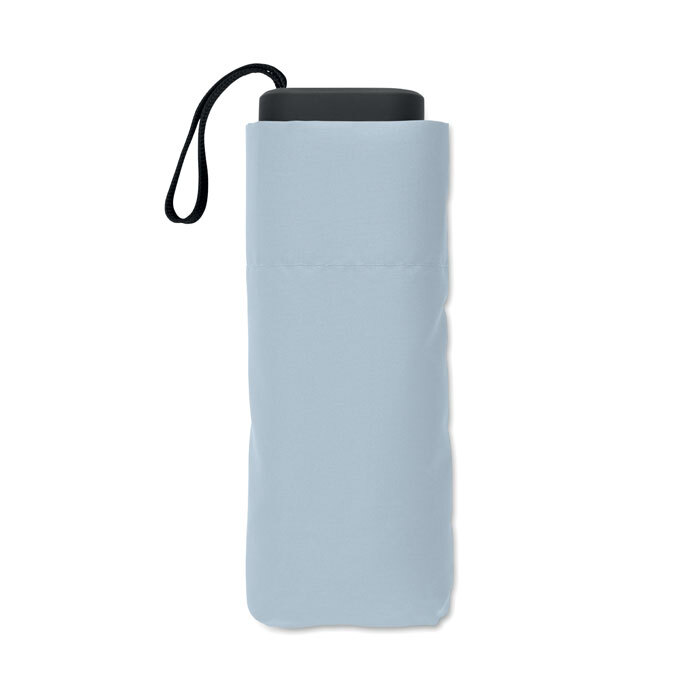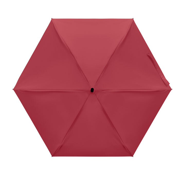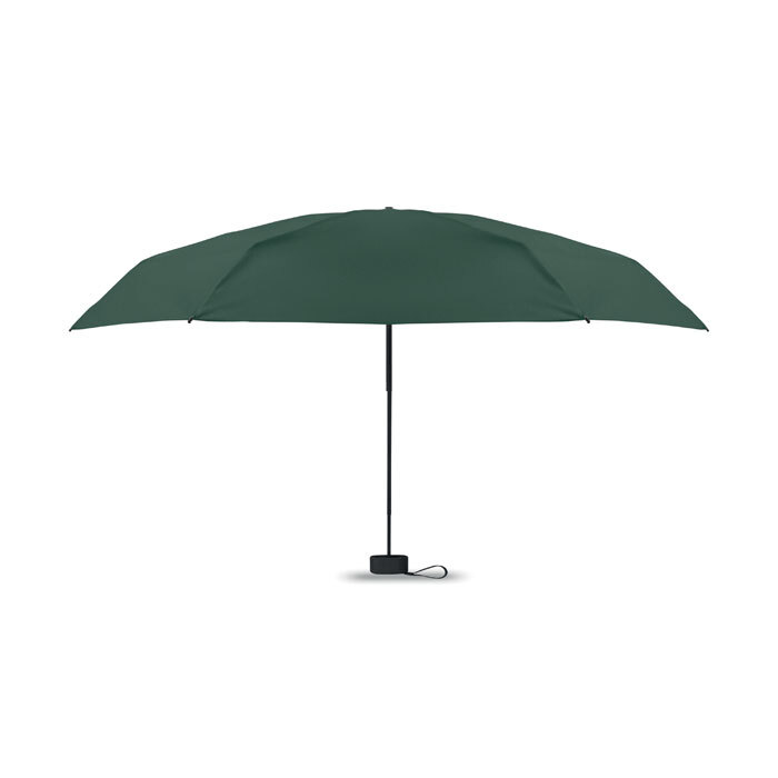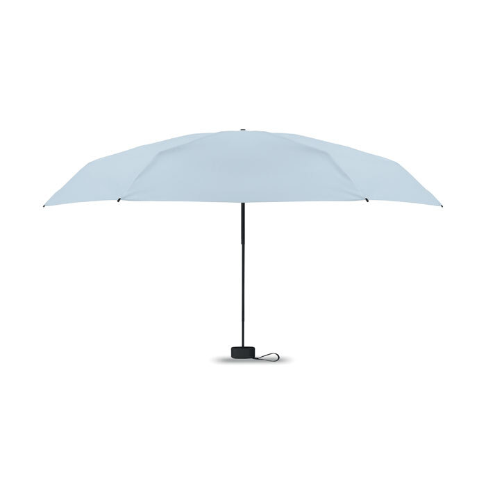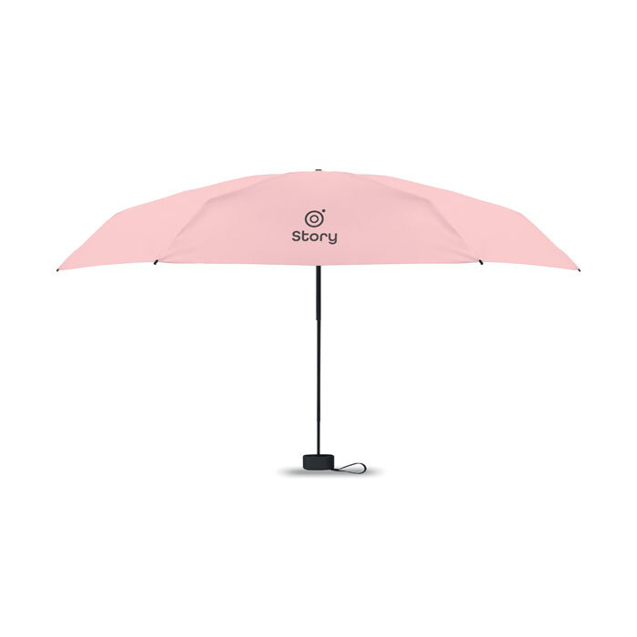 Ombrello manuale 5 pieghe da 19 in pongee 190T custodia abbinata. Struttura antivento in metallo e fibra di vetro, manico gommato nero con cinturino da polso e dimensioni compatte di 17 cm da chiuso.