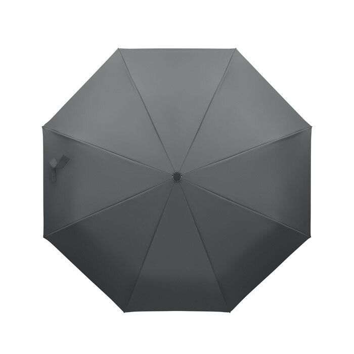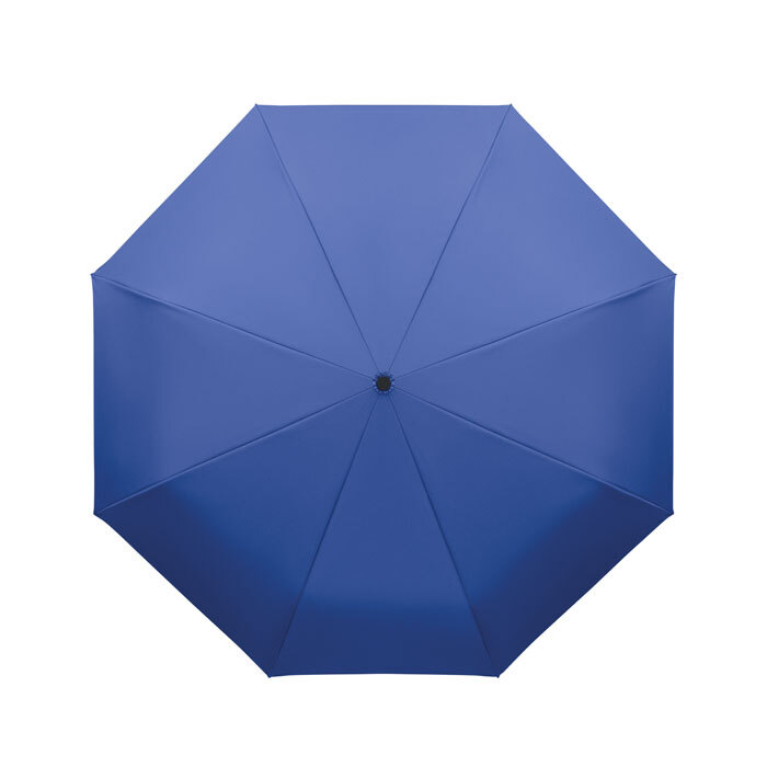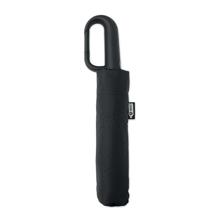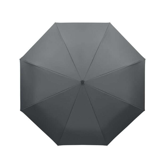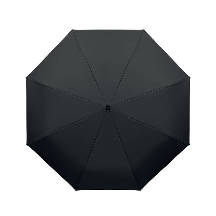 Ombrello pieghevole antivento da 21'' con struttura in fibra di vetro a 2 sezioni con placcatura nera. Costole in fibra di vetro. pannelli in pongee 190T RPET. Manico a D con moschettone e finitura in gomma. Apertura e chiusura automatica. Include custodia