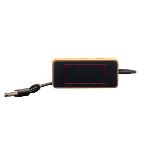 Hub USB 8 in 1 realizzato in bambù e PET riciclato provenienti da fonti responsabili, in grado di collegare fino a 6 dispositivi contemporaneamente con 3 porte USB-A e 3 porte di tipo C. Completamente compatibile con i computer moderni, è dotato di un logo LED personalizzabile e viene fornito in una confezione regalo in cartone riciclato, che unisce funzionalità e design. Velocità di trasferimento: USB/480 Mbps. Dimensione: 8 x 3,5 x 1,5 cm. Lunghezza del cavo: 24 cm.