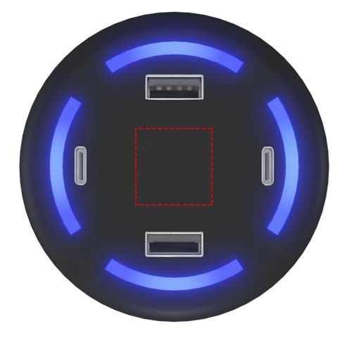 Caricabatterie smart home da 4,2 A con finitura in gomma soft-touch e logo luminoso. Grazie alle porte da 5 V/2,4 A, è possibile caricare fino a 4 dispositivi contemporaneamente. Il caricabatterie è dotato di uscite USB e USB Tipo C da 2,4 A. Ogni porta presenta un indicatore luminoso blu che si illumina quando un dispositivo viene ricaricato. Una volta che il dispositivo è completamente carico, l'indicatore si spegne per risparmiare energia. Prese di corrente UE e USA incluse. Con confezione regalo in carta kraft riciclata (9,8 x 12,3 x 5,3 cm). Garanzia di 3 anni inclusa.