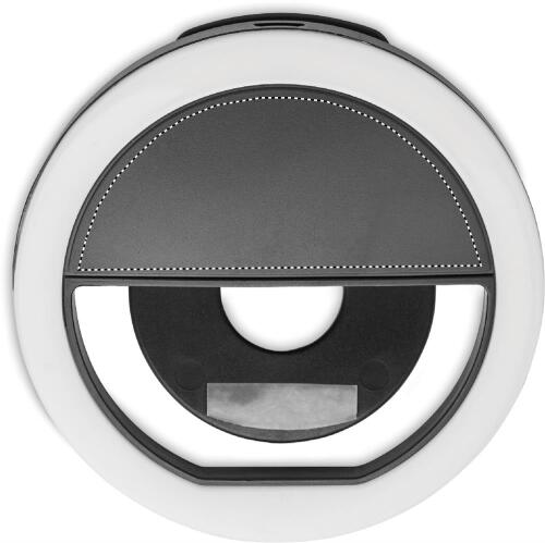 Anello luminoso portatile per selfie da 8 cm in ABS, con 28 LED. Luce bianca regolabile su 3 diversi livelli di luminosità. Batteria ricaricabile USB da 80 mAh.