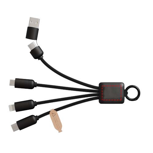 Cavo di ricarica 5 in 1 con 3 connettori (Tipo C, Android, iPhone) e cavi in PET riciclato (realizzati con bottiglie di plastica riciclate). Grazie al doppio ingresso USB-A e USB-C, il cavo è compatibile al 100% con i computer più recenti presenti sul mercato (USB-C). Finitura effetto metallo sui tappi terminali. Con il cavo si possono caricare fino a 3 dispositivi contemporaneamente. Consegnato in una custodia in materiale riciclabile e una scheda in carta riciclata.
