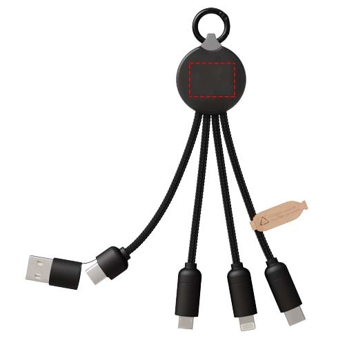 Cavo di ricarica 5 in 1 con 3 connettori (Tipo C, Android, iPhone) e cavi in PET riciclato (realizzati con bottiglie di plastica riciclate). Grazie al doppio ingresso USB-A e USB-C, il cavo è compatibile al 100% con i computer più recenti presenti sul mercato (USB-C). Finitura effetto metallo sui tappi terminali. Con il cavo si possono caricare fino a 3 dispositivi contemporaneamente. Consegnato in una custodia in materiale riciclabile e una scheda in carta riciclata.
