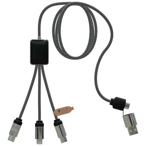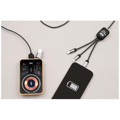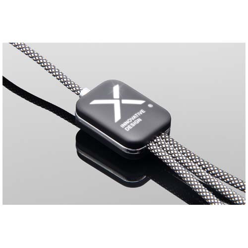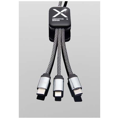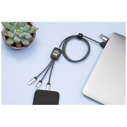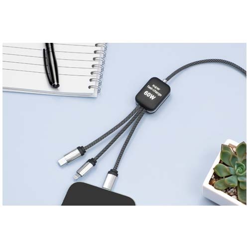 Questo cavo di ricarica da 1 metro e 60 W è caratterizzato da un'elegante finitura in gomma e metallo, cavi realizzati in bottiglie di plastica riciclate e da due loghi illuminati, ciascuno personalizzabile e diverso dall'altro. Dotato di tre connettori (2 x Tipo-C e 1 x Lightning), può caricare due o tre dispositivi contemporaneamente. Il doppio ingresso USB-A e USB-C garantisce la completa compatibilità con i computer più recenti, compresi i modelli USB-C. Il cavo è personalizzabile su entrambi i lati ed è confezionato in una custodia in TPU riciclabile con un cartoncino di supporto in carta riciclata.