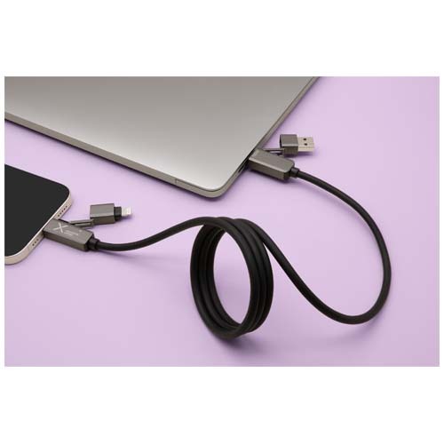 Cavo di ricarica magnetico ultraveloce da 100 W che alimenta smartphone, tablet e portatili. Il cavo piatto da 1 metro è dotato di connettori Tipo-C e Lightning, cavi in silicone riciclato e resistenti terminali in lega di zinco. Grazie a un doppio ingresso USB-A e USB-C, questo cavo è compatibile al 100% con gli ultimi modelli di computer. Completamente compatibile con Apple CarPlay e Android Auto. La personalizzazione è disponibile tramite incisione laser sul terminale in zinco. Fornito con una custodia in TPU riciclabile e un inserto in carta riciclata.