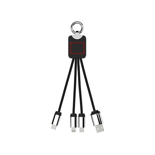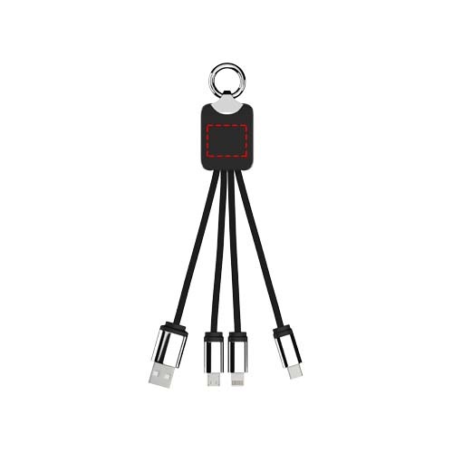 Cavo di ricarica con logo luminoso, finitura in gomma e dotato di tre connettori (tipo C, Android, iPhone). È possibile caricare fino a tre dispositivi contemporaneamente. Lunghezza dei cavi (spine incluse): 10 cm. Cavo in plastica PET riciclata ed'imballaggio realizzato in carta e plastica riciclata.