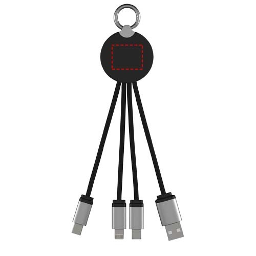 Cavo di ricarica con logo luminoso, finitura in gomma e dotato di tre connettori (tipo C, Android, iPhone). È possibile caricare fino a tre dispositivi contemporaneamente. Lunghezza dei cavi (spine incluse): 10 cm. Cavo in plastica PET riciclata ed'imballaggio realizzato in carta e plastica riciclata.