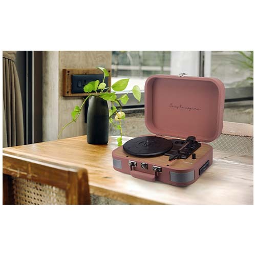 Giradischi per vinili e lettore musicale con Bluetooth® 5.0, USB, TF e radio FM. Può digitalizzare il vinile in formato WAV tramite l'ingresso USB e l'entrata TF. Dispone di uscita audio RCA e viene fornito con un paio di cuffie. Inclusa una testina rubino per riprodurre i dischi delicatamente. Con design a forma di valigetta. Il giradischi può essere collegato a un dispositivo mobile tramite Bluetooth® per utilizzare la funzione di speaker.