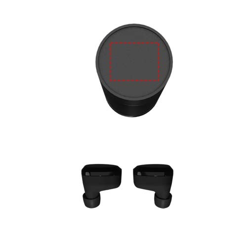 Auricolari wireless con qualità audio premium. Gli auricolari possono essere riposti e ricaricati nella base in metallo a forma cilindrica, decorabile con la stampa luminosa di un logo. La batteria nella base può ricaricare gli auricolari due volte. Microfono incorporato. Bluetooth® 5.0. Tecnologia EDR (Enhanced Data Rate). Gli auricolari sono rivestiti con finitura in gomma e sottoposti a trattamento antibatterico. Includono gommini di 3 diverse dimensioni per un'esperienza di ascolto ottimale. Brevetto EUIPO EUROPA. Fornita in una confezione regalo di colore nero (10 x 6 x 3,5 cm) con chiusura magnetica. Garanzia di 3 anni inclusa.