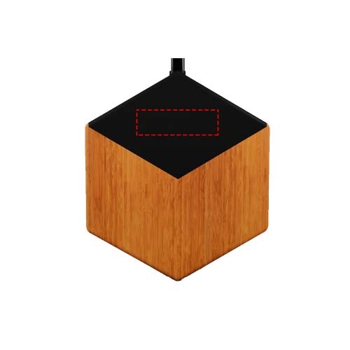 Caricabatterie wireless da 10 W di forma esagonale, realizzato in gomma e bambù con trattamento antibatterico e logo luminoso. Fornito in una confezione regalo nera realizzata in carta kraft riciclata con cavo in plastica PET riciclata. Brevetto EUIPO EUROPA.