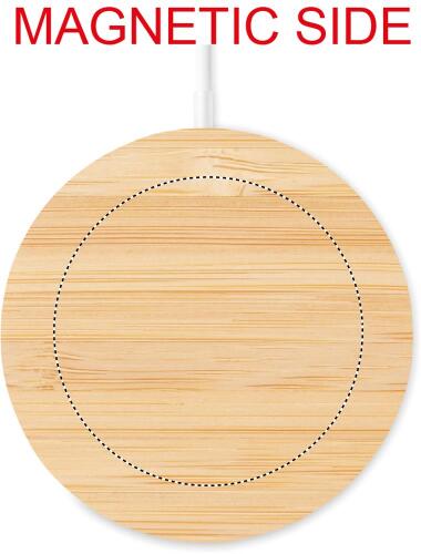 Caricabatterie wireless magnetico in bamboo. Uscita: DC 9V/1.1A (10W) per una ricarica più rapida. Compreso anello metallico magnetico per la ricarica di altri telefoni ricaricabili wireless non magnetici.