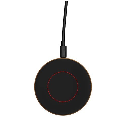 Stazione di ricarica wireless da 10 W realizzata in gomma e legno con cavo di ricarica realizzato in plastica PET riciclata. Può essere decorata con un logo luminoso. Fornita in confezione regalo realizzata in carta kraft nera con meccanismo di chiusura magnetico. Brevetto EUIPO EUROPA.