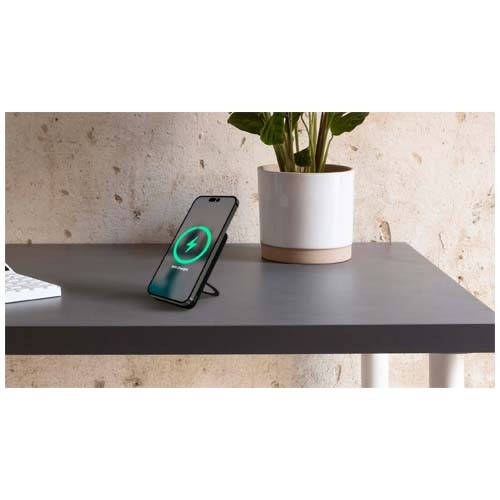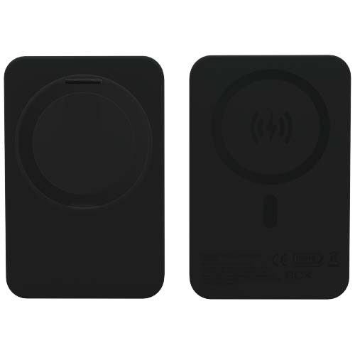 Power bank sottile da 5000 mAh con tecnologia MagSafe realizzato in alluminio e plastica riciclati. È dotato di un display digitale anteriore che mostra il livello della batteria in percentuale. Un supporto ad anello pieghevole consente di posizionare il telefono in verticale o in orizzontale per un utilizzo ottimale durante la ricarica. Per i telefoni privi di tecnologia MagSafe integrata (iPhone 12 e successivi), è incluso un anello magnetico. Il power bank personalizzabile con un logo specchiato inciso al laser ed è fornito in una confezione regalo in cartone riciclato.