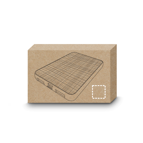 Power bank realizzato in PET riciclato (100% rPET). Batteria portatile con capacità di 5'000 mAh, una porta di ingresso microUSB, una porta USB-C e due porte di uscita USB-A. Include un cavo di ricarica microUSB. Fornito in una confezione regalo in carta kraft. 65 x 98 x 10 mm