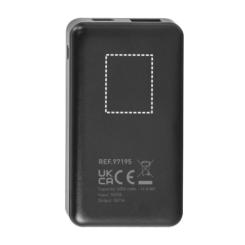 Power bank ultraleggero, con dimensioni compatte e indicatore di carica. È la soluzione ideale per portarlo sempre con sé e avere sempre a disposizione l'alimentazione necessaria in situazioni di emergenza.Materiale: ABS riciclato (100% rABS)Capacità: 4'000 mAhIngresso: USB-C (10W)Uscita: USB-C, USB-A (10W)Include: cavo USB-A/USB-CConfezione: confezione regalo in carta kraft riciclata 87 x 48 x 17 mm | Box: 75 x 90 x 18 mm
