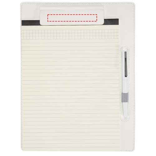 Il portablocco Clast combina un design elegante in pelle PU con caratteristiche pratiche sia per le riunioni che per l'uso quotidiano. È adatto per pagine standard A4 e comprende una clip magnetica, bordi cuciti e un passante per penna incorporato. All'interno si trovano 26 fogli a righe di carta da 65 g/m² e una penna a sfera con fusto superiore realizzato in plastica riciclata e fusto inferiore in alluminio riciclato certificato RCS. La penna a sfera Juana è disponibile anche separatamente. Dimensioni del portablocco: 25,5 x 33 cm. Colore inchiostro della penna: nero.