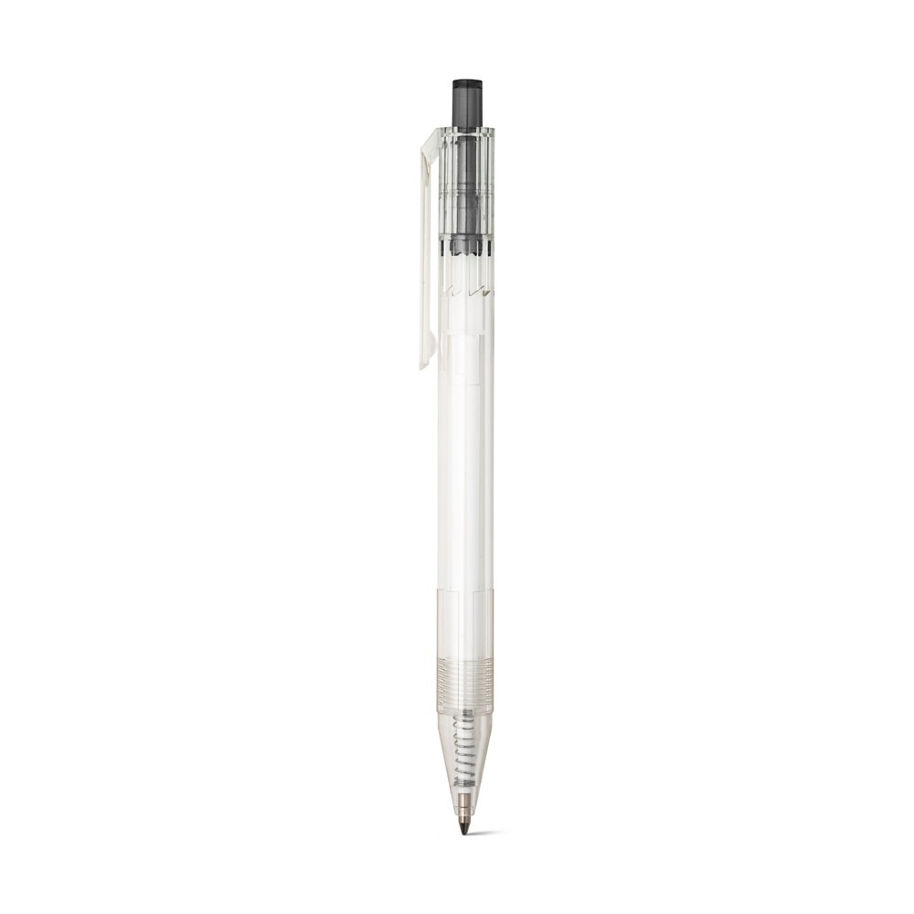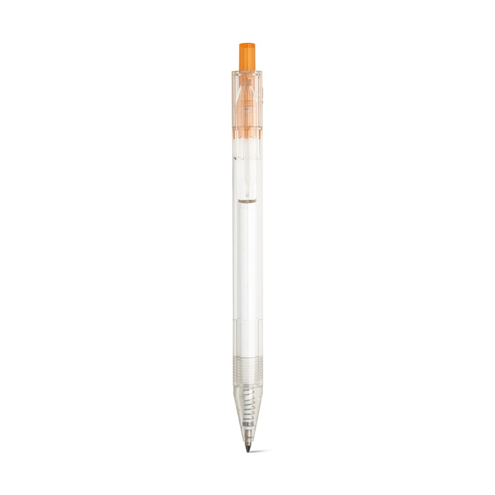 Penna a sfera in 100% rPET trasparente con pulsante scatto colorato. Inchiostro nero