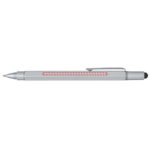 La penna a sfera multifunzione in alluminio Dora è realizzata in parte con materiali riciclati ed è dotata di righello a doppio lato, livella a bolla, cacciavite, gradiente e uno pennino nero in gomma. Il fusto è realizzato in alluminio riciclato con rivestimento verniciato a spruzzo color argento. La clip è realizzata in ferro. Il cacciavite è realizzato in acciaio. La parte superiore e la punta sono realizzate in plastica ABS riciclata. Colore dell'inchiostro: Nero. Capacità di scrittura: 400 metri. Dimensione del pennino: 1,0 mm.