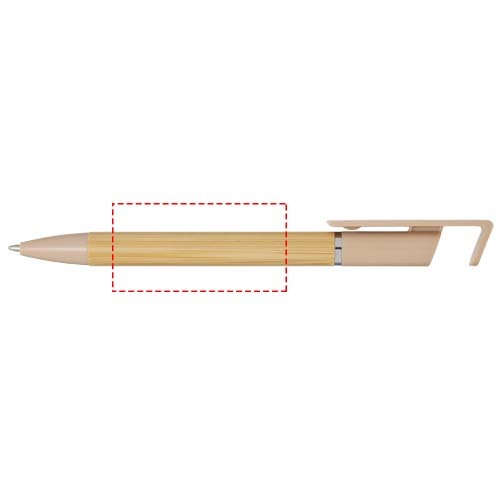 Penna a sfera in bambù che funge anche da supporto per smartphone. Il pulsante e l'anello centrale sono in plastica riciclata, la punta è in ottone e il fusto è in bambù proveniente da fonti responsabili. Colore dell'inchiostro: Nero. Capacità di scrittura: 1000 metri. Dimensione del pennino: 1,0 mm.