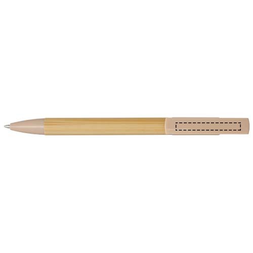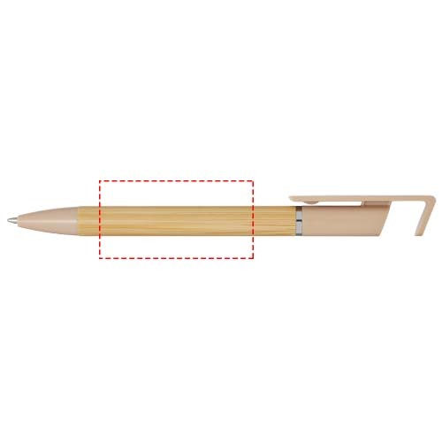 Penna a sfera in bambù che funge anche da supporto per smartphone. Il pulsante e l'anello centrale sono in plastica riciclata, la punta è in ottone e il fusto è in bambù proveniente da fonti responsabili. Colore dell'inchiostro: Blu. Capacità di scrittura: 1000 metri. Dimensione del pennino: 1,0 mm.