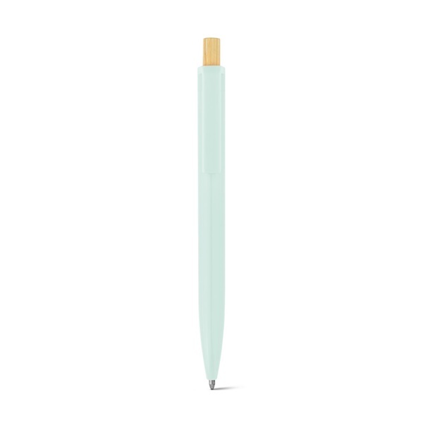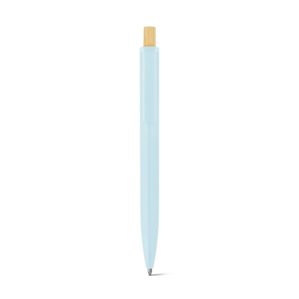 Penna a sfera in ABS riciclato (100% rABS) con pulsante in bambù. Inchiostro blu. Poiché il prodotto è realizzato con materiali naturali, il colore del prodotto e il risultato della stampa possono variare da un prodotto all'altro. ø11 x 134 mm