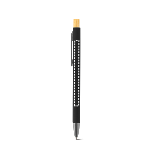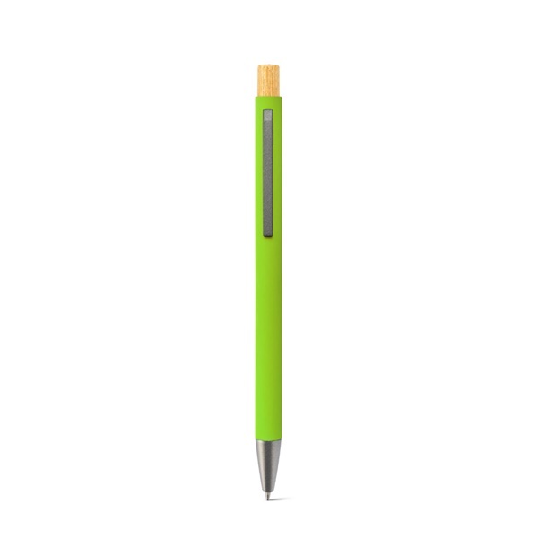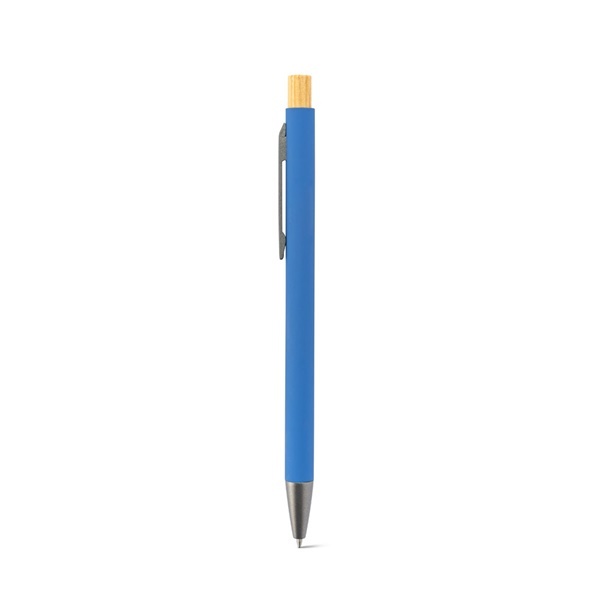 Penna a sfera in alluminio riciclato (100% RAL) con finitura in gomma. Il suo design minimalista combina dettagli grigio metallizzato opaco e un pulsante in bambù nella parte superiore. È dotata di clip e scrittura blu. Poiché il prodotto è realizzato con materiali naturali, il colore del prodotto e il risultato della stampa possono variare da un prodotto all'altro. ø9 x 135 mm