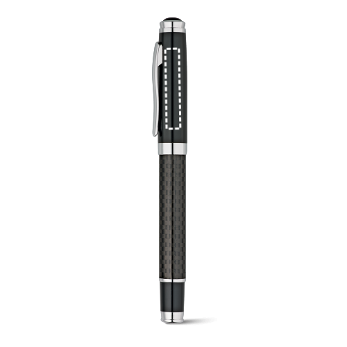 Set di penna roller e penna a sfera in metallo e fibra di carbonio, entrambe con clip. Penna a sfera con meccanismo a rotazione. Refill nero. Fornito in confezione di PU e imbottita. ø13 x 139 mm | Custodia: 195 x 100 x 47 mm