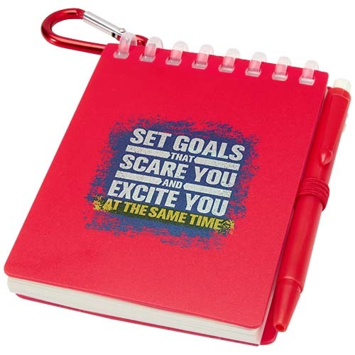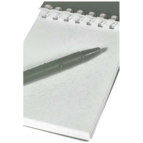 Il set di penna e blocco note Lig Mini è un accessorio compatto e pratico per prendere appunti quando si è in giro. Il blocco note con rilegatura a spirale è dotato di una morbida copertina in plastica riciclata e di 70 fogli bianchi in carta di pietra da 120 g/m² resistente all'acqua, ideale per l'uso all'aperto. Grazie agli angoli arrotondati e il passante per la penna incorporato, è assolutamente di tendenza grazie alle mini dimensioni pur rimanendo funzionale. La penna a sfera abbinata è realizzata in plastica ABS riciclata, scrive con inchiostro nero e offre una lunghezza di scrittura di 250 metri. Un anello metallico in colore abbinato consente di agganciare facilmente il set a uno zaino, a una borsa o a un portachiavi, rendendolo perfetto per prendere appunti in modo durevole e pratico. Dimensioni del blocco note: 11 x 7,5 cm.