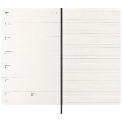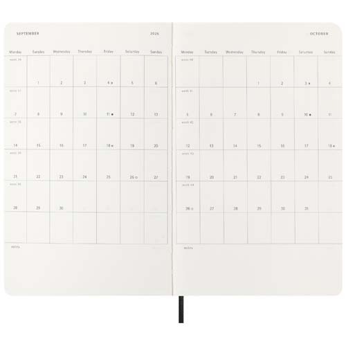 Con durata gennaio-dicembre 2026, l'agenda settimanale 12 mesi Moleskine con copertina morbida mostra l'intera settimana a colpo d'occhio, oltre a pagine con panoramica annuale e mensile per una visione più ampia dell'anno, seguite da pagine per la pianificazione di viaggi, idee e obiettivi. I giorni di ogni settimana sono indicati su un lato, mentre a destra è presente una pagina a righe per impegni e appunti. Dispone di una carta priva di acidi color avorio, una chiusura con elastico nero, un segnalibro a nastro, una tasca interna espandibile in colore coordinato, adesivi per la personalizzazione e adesivi dell'anno per il dorso.