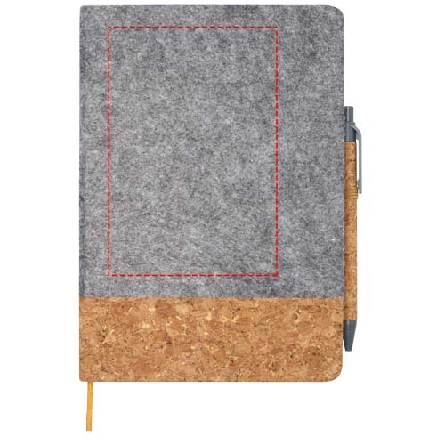 Il blocco note in formato A5 con copertina rigida è realizzato in sughero e feltro riciclato ed è provvisto di 80 fogli a righe in carta da 70 g/m², chiusura con elastico, segnalibro e passante per la penna. Il pulsante, la clip e la punta della penna a sfera sono realizzati in plastica riciclata, mentre il fusto è realizzato in sughero. Inchiostro penna: Nero. Capacità di scrittura: 600 metri. Dimensione del pennino: 1,0 mm.