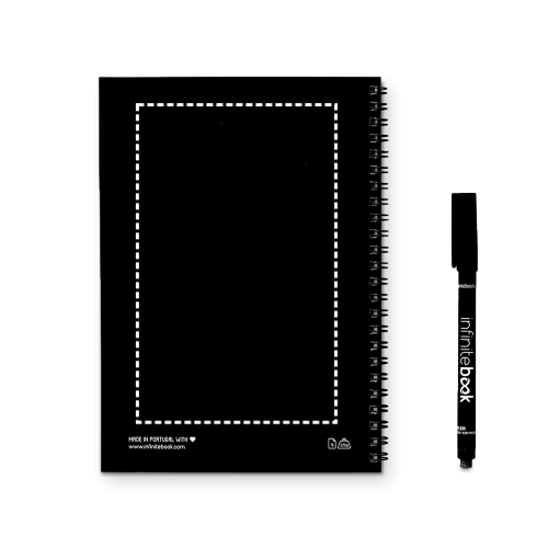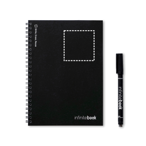 Block notes A5 - "Infinitebook" - con copertina flessibile e spirale colorata. Contiene 15 pagine stile lavagna bianca e un pennarello nero. Questo quaderno consente di cancellare facilmente quello che si scrivere ed è una soluzione pratica per ridurre al minimo il consumo di carta. Le note possono essere scannerizzate. Prodotto in Europa. Fornito in una busta di carta kraft con un adesivo. 148 x 210 mm
