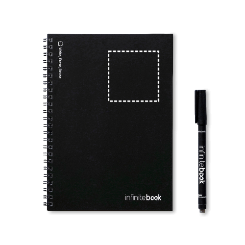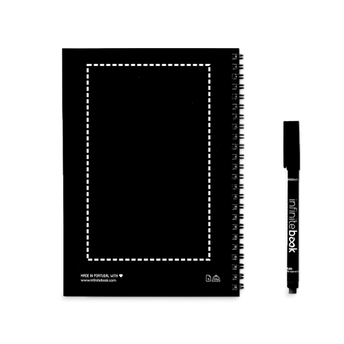 Block notes A5 - "Infinitebook" - con copertina flessibile e spirale colorata. Il quaderno ha 15 pagine stile lavagna bianca e un pennarello nero. Consente inoltre di cancellare facilmente quello che si scrivere ed è una soluzione pratica per ridurre al minimo il consumo di carta. Le note possono essere scannerizzate. Prodotto in Europa. Fornito in una busta di carta kraft con un adesivo. 148 x 210 mm