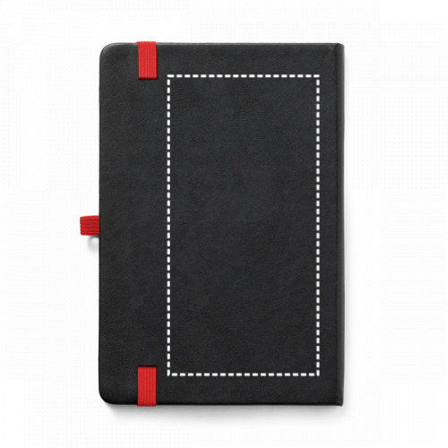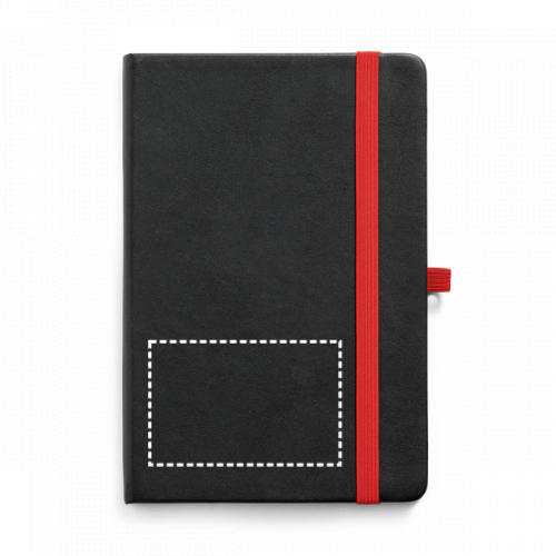 Block notes A5 con copertina rigida in PU e 160 pagine a righe. Il block notes è fornito con un sottostrato colorato nella copertina. In caso di personalizzazione laser il fondo risulterà dello stesso colore dell'elastico. Presenta elastico, nastro separatore, tasca interna in carta sul retro e supporto per penna a sfera (non inclusa)