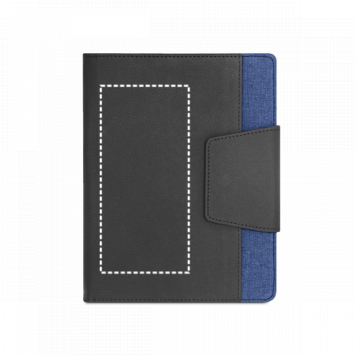 Copertina in PU e tessuto in poliestere, con block notes A5 all'interno. Presenta chiusura magnetica, tasca esterna, tasca interna e supporto per penna a sfera (non inclusa). Il taccuino rimovibile contiene 160 pagine lisce (70 g/m²), realizzato con materiale certificato FSC™ e altri materiali controllati. Fornito in una borsa in TNT. 155 x 215 mm | Custodia: 205 x 250 mm