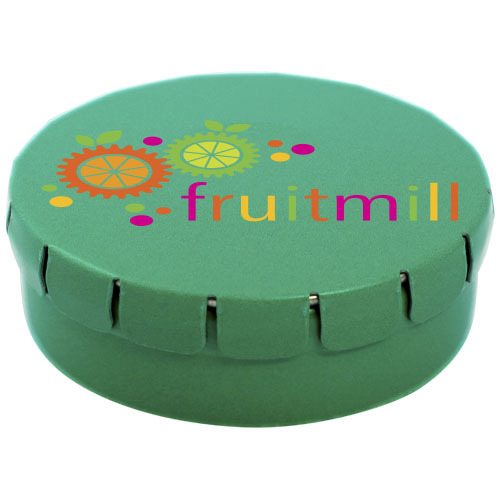 Mentine senza zucchero in contenitore di latta con facile apertura a scatto. Il contenitore può essere ordinato in una vasta gamma di colori e riempito con caramelle dai gusti diversi: mentine tradizionali, mentine extra forti, mentine senza zucchero, gelatine di frutta, caramelle a forma di cuore e al gusto fragola, cannella, caramelle al limone e menta o cioccolatini. Il coperchio può essere decorato con una stampa digitale a colori.