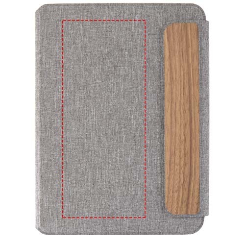 Il portadocumenti formato A5 Andean è parzialmente realizzato in poliestere riciclato post-consumo certificato RCS, che offre un'alternativa più sostenibile riducendo la dipendenza da materiali vergini. Progettato con un'elegante copertina rigida grigia con angoli arrotondati e tecnologia di saldatura di precisione, è fissato con una chiusura magnetica accentuata da una raffinata decorazione in legno di noce, che conferisce un tocco moderno e sofisticato. All'interno è presente un blocco note rimovibile con copertina morbida e 64 fogli a righe color crema, realizzati con carta da 80 g/m² proveniente da fonti responsabili. Fornito in una custodia colorata in carta kraft.