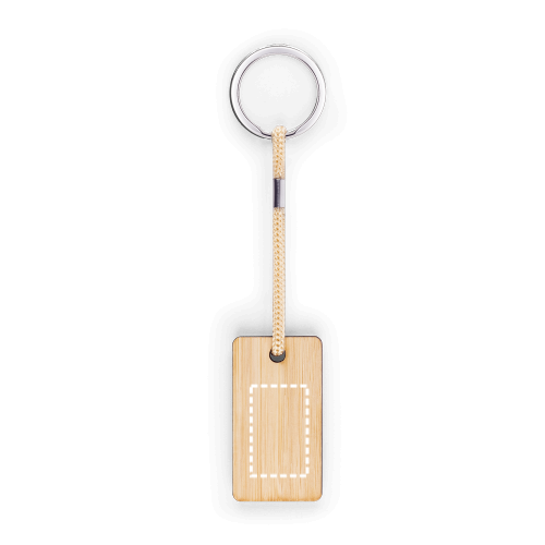 Portachiavi rettangolare in bambù con cordino in PET. Contiene un anello di ferro per un facile trasporto