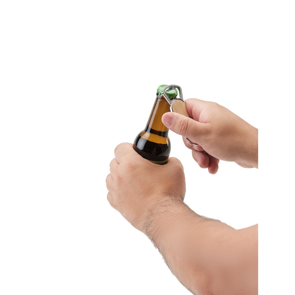 Portachiavi in ferro con forma rotonda in zinco e bambù. La funzione apribottiglie rende questo portachiavi un accessorio pratico da avere sempre a portata di mano. Fornito in un sacchetto di carta kraft. Poiché il prodotto è realizzato con materiali naturali, il colore del prodotto e il risultato della stampa possono variare da un prodotto all'altro. Anello: ø 32 mm | Prodotto: 58 x 39 x 3 mm | Connettore: 9 mm | Totale: 90 x 39 x 3 mm | Borsa: 100 x 55 mm