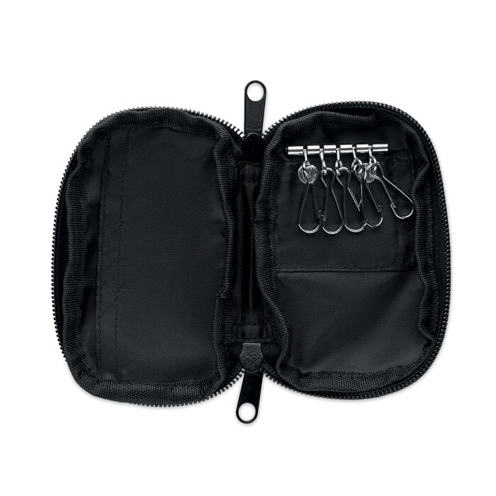 Custodia per chiavi con cerniera in 300D RPET con fodera in 210D RPET. Dotato di 5 portachiavi.