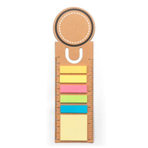Set da ufficio 3 in 1 realizzato in carta riciclata al 100%, con parte superiore arrotondata e stampa nera sui bordi. Include un blocco di foglietti adesivi (60 g/m²) con 15 fogli di carta riciclata al 100% di colore giallo e cinque piccoli blocchi di foglietti adesivi con 15 fogli ciascuno, realizzati in carta riciclata al 100% in vari colori: arancione, giallo, rosa, verde chiaro e blu. Due righelli sono posizionati ai margini: quello a sinistra ha una scala in centimetri (cm) e quello a destra ha una scala in pollici. La sua versatilità permette di utilizzarlo come segnalibro o come fermaglio quando è attaccato a un set di fogli